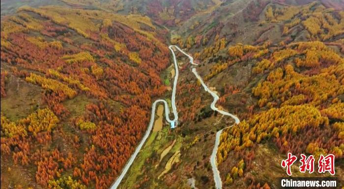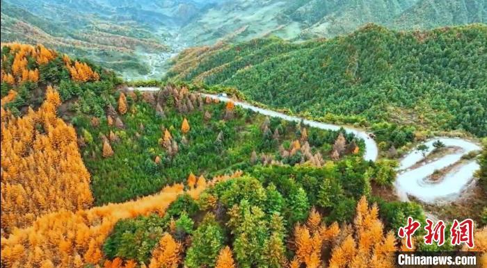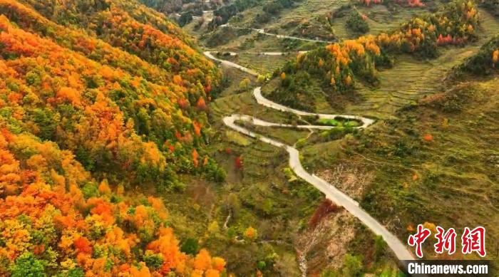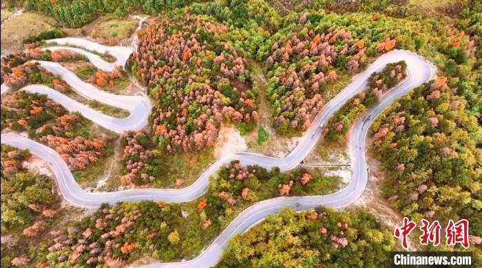 初冬時節,甘肅省隴南市武都區公路旁仍然一派秋日景象,黃紅綠相間的公路甚是好看,公路在暖陽的擁抱下,緩緩鋪展向遠方。圖為蜿蜒公路兩旁五彩繽紛的景色。龍金鈴 攝