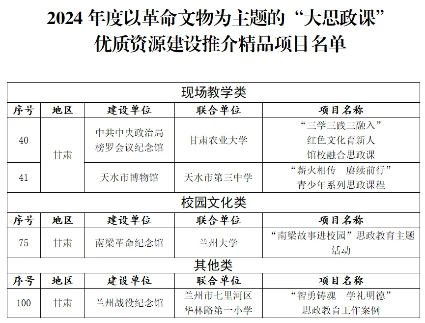 其中,甘肅省4項案例入選。分別是,中共中央政治局榜羅鎮(zhèn)會議紀念館、甘肅農(nóng)業(yè)大學“三學三踐三融入”紅色文化育新人館校融合思政課;天水市博物館、天水市第三中學“薪火相傳 賡續(xù)前行”青少年系列思政課程;南梁革命紀念館、蘭州大學“南梁故事進校園”思政教育主題活動;蘭州戰(zhàn)役紀念館、蘭州市七里河區(qū)華林路第一小學“智勇鑄魂 學禮明德”思政教育工作案例。