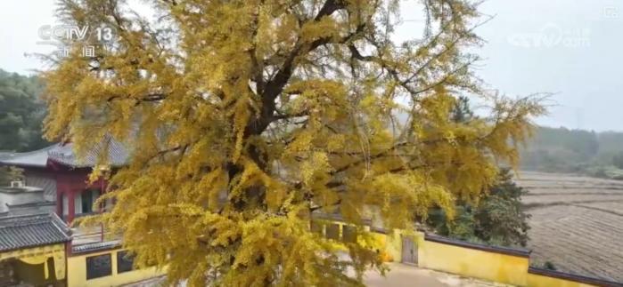 在江西撫州臨川區(qū),一株千年銀杏樹迎來了最佳觀賞期。一片片黃色的銀杏葉猶如一串串金色風(fēng)鈴,掛滿樹梢。