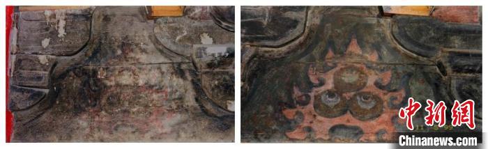 圖為1999年拍攝的長樂門內檐彩畫顏料層顯色加固前后對比。(陜西師范大學歷史文化遺產保護教育部工程研究中心供圖)