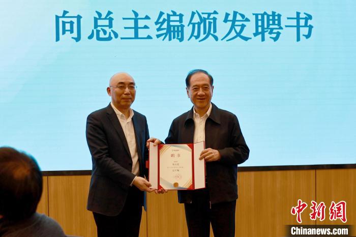 上海世紀出版集團黨委副書記、總裁闞寧輝向韓啟德總主編頒發聘書。 少年兒童出版社 供圖