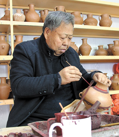 在臨洮縣文化館有關負責人的鼓勵下,僅有初中文化程度的閻建林開始了彩陶制作技藝的探索。選料是第一步,為找到與古彩陶胎質相近的陶土,閻建林三天兩頭到馬家窯遺址研究碎陶片,又多次去往博物館看實物,自費購買書籍、泡在圖書館查資料,終于找到柔韌度高、可塑性強的紅膠泥土。