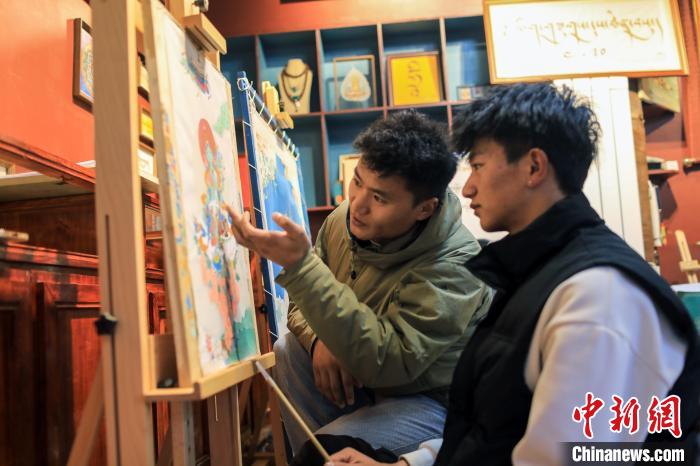 四川省甘孜藏族自治州理塘縣勒通古鎮,是一個融合了特色傳統文化和現代創新的重要旅游目的地。近年來,理塘縣強化地域特色文化的保護,并引導當地居民打造了一系列特色文化旅游新項目。唐卡、皮具工藝、藏文書法及土陶制作等傳統工藝項目不僅得到了保護,還吸引了大量游客前來觀賞和交流。圖為12月22日,在勒通古鎮的“唐卡館”,畫師昂旺登登(左)指導洛絨曲扎繪制唐卡。中新社記者 王磊 攝