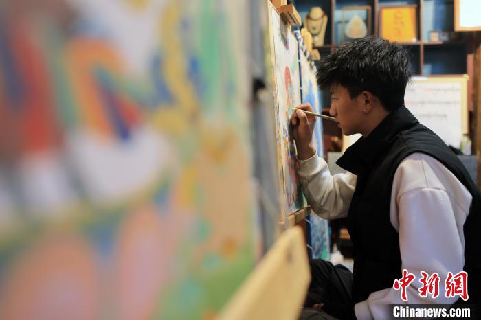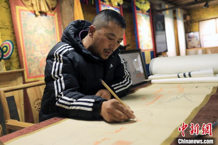 12月22日,在勒通古鎮的“唐卡館”,21歲的洛絨曲扎正在繪制唐卡。中新社記者 王磊 攝