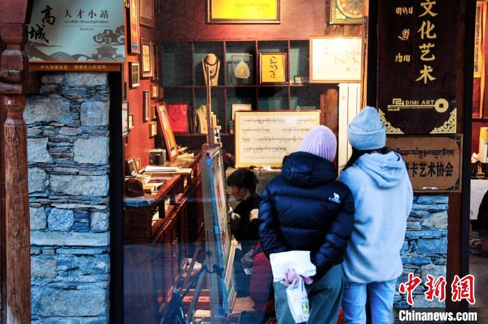 12月22日,在勒通古鎮的“唐卡館”,一位畫師繪制唐卡吸引游客駐足觀看。中新社記者 薛蒂 攝