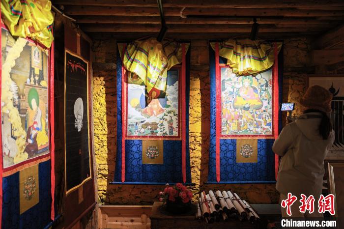 12月22日,一位游客拍攝展示的唐卡。中新社記者 薛蒂 攝