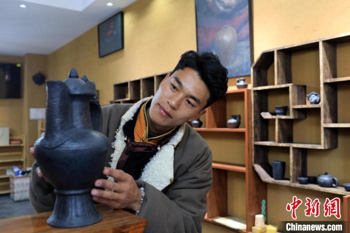 12月22日,在勒通古鎮的一家陶藝館內,陶藝師土登擺放土陶作品。中新社記者 王磊 攝