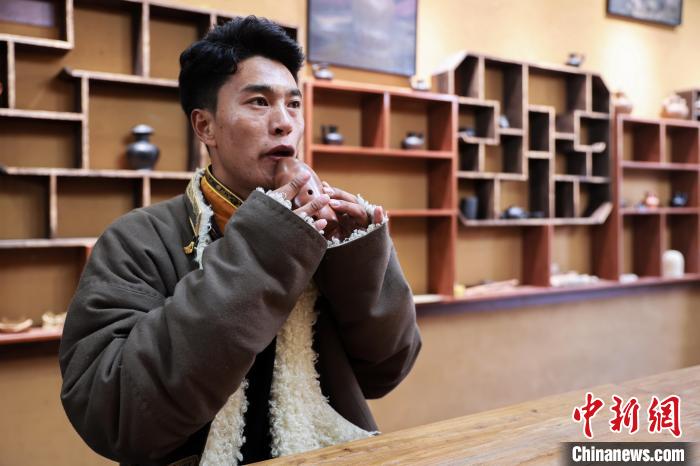 12月22日,在勒通古鎮的一家陶藝館內,陶藝師土登吹奏土陶制作的塤。中新社記者 薛蒂 攝