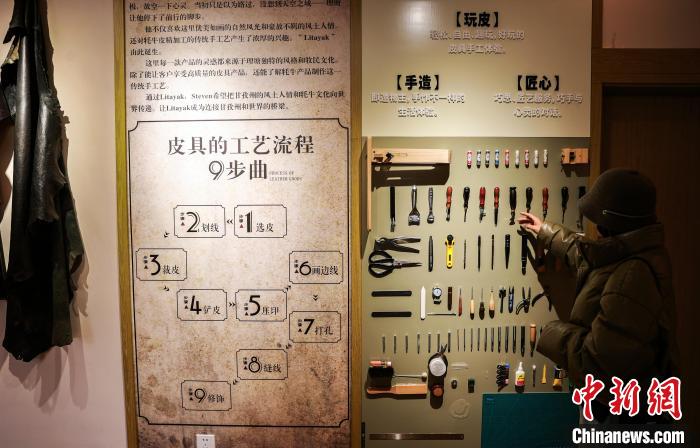 12月22日,在勒通古鎮的一家皮具店內,游客被掛在墻上的工具所吸引。中新社記者 薛蒂 攝