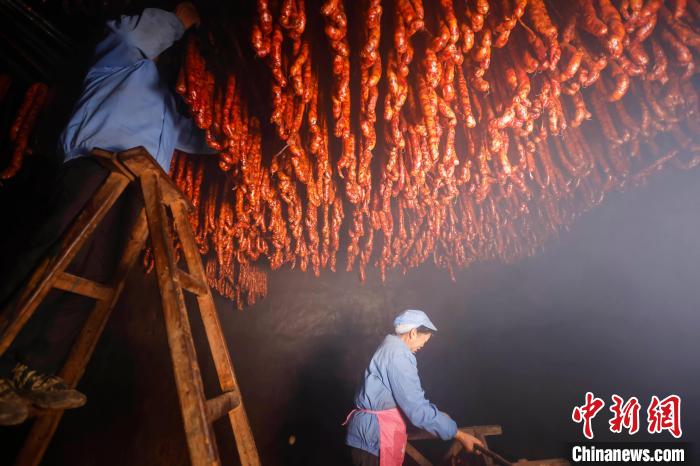 圖為貴州施秉一企業(yè)工人在下架剛熏制好的香腸。新年臨近,貴州省黔東南苗族侗族自治州施秉縣部分農(nóng)戶和企業(yè)紛紛加工趕制臘肉、香腸、血豆腐等傳統(tǒng)臘味,通過“線上+線下”銷售方式,供應(yīng)市場,喜迎新年。磨桂賓 攝