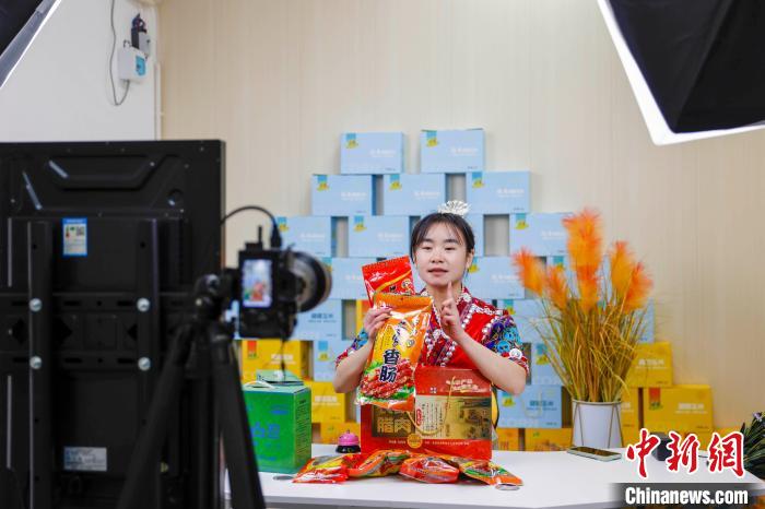圖為貴州施秉一主播在推介熏制的臘肉、香腸等特色農(nóng)產(chǎn)品。磨桂賓 攝