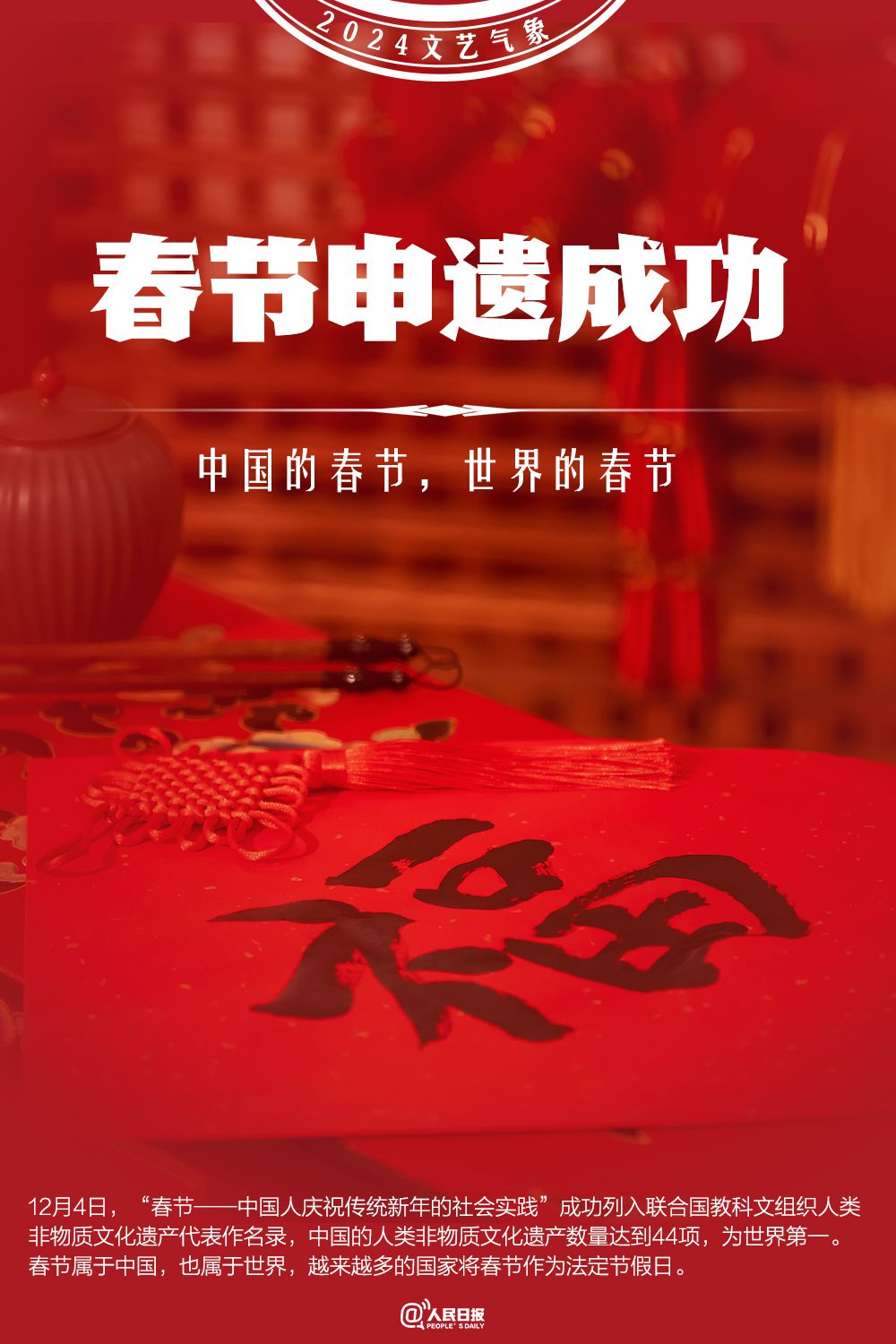 2024年7月27日,“北京中軸線——中國理想都城秩序的杰作”成功列入《世界遺產名錄》,中國世界遺產總數達到59項。12月4日,“春節——中國人慶祝傳統新年的社會實踐”成功列入聯合國教科文組織人類非物質文化遺產代表作名錄,至此,中國共有44個項目列入聯合國教科文組織非物質文化遺產名錄、名冊,總數居世界第一。