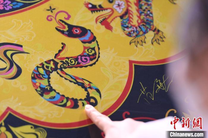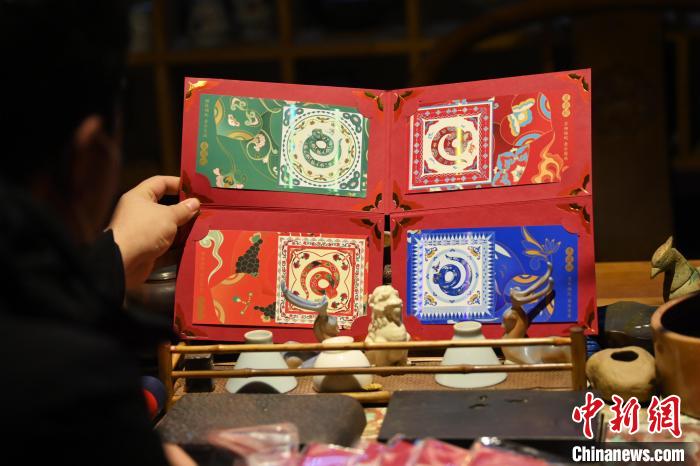 1月10日,在甘肅省敦煌市敦煌畫院內,游人參觀由敦煌畫院設計授權的中國郵政《敦煌福蛇》極限型明信片。中國郵政《敦煌福蛇》極限型明信片從敦煌壁畫里的藻井汲取靈感,集合敦煌紋樣、民藝剪紙等中國傳統藝術內容,以春萌蛇、夏長蛇、秋實蛇、冬藏蛇對應著四季祝福。中新社記者 李亞龍 攝