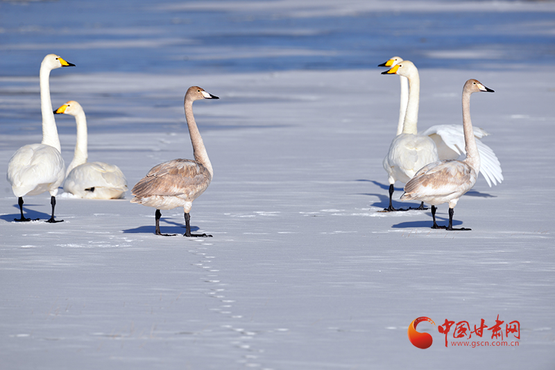 中國甘肅網2月7日訊(西北角·中國甘肅網記者 張慧雅 通訊員 何文麗 王建忠)近日,甘肅敦煌陽關國家級自然保護區管護中心工作人員通過視頻巡查,監測到了11只越冬的國家二級保護野生動物——大天鵝。它們或在雪地里漫步,或梳理羽毛,姿態優雅,為寒冷的冬日增添了一抹靈動的色彩。