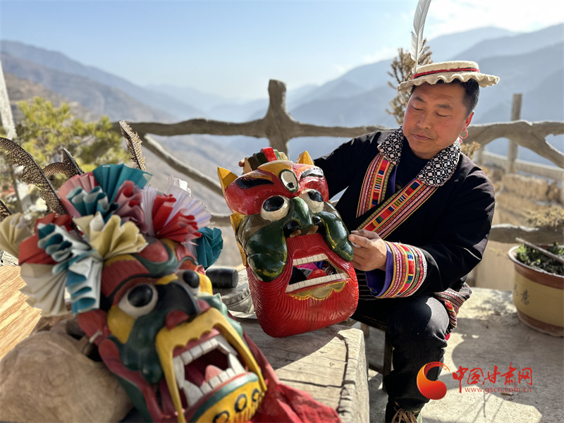 甘肅隴南市文縣鐵樓藏族鄉強曲村,白馬群眾薛剛一家四代人都精于木工。薛剛坐在自家院子里,伏案制作池哥晝所用面具。池哥晝是白馬人保留最完整、最具特色民族舞蹈,面具是重要道具之一。