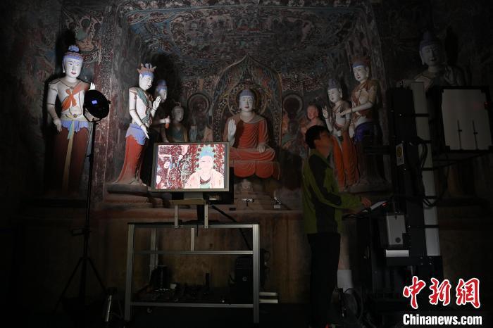 2024年6月5日,甘肅省敦煌市莫高窟內,敦煌研究院文物數字化研究所工作人員進行敦煌壁畫數字化采集工作。 中新社記者 李亞龍 攝
