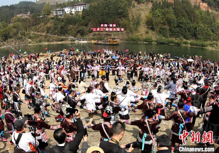 2024年3月11日,在廣西三江侗族自治縣梅林鄉(xiāng),“二月二”侗族大歌節(jié)活動吸引游客前來體驗侗鄉(xiāng)風情。圖為民眾在跳多耶舞?! 蔷殑?nbsp;攝