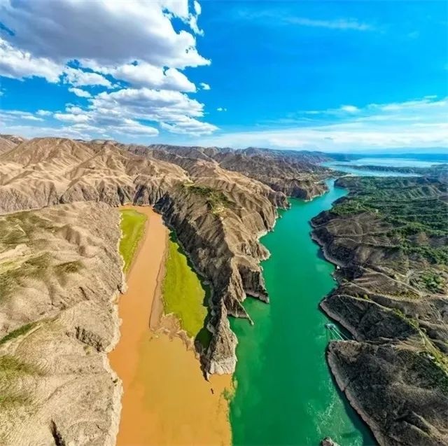 在永靖縣劉家峽大壩附近,黃河與洮河以“Y”字形交匯,形成了“黃洮交匯”的奇觀。黃河水清澈碧藍,而洮河則因攜帶大量泥沙呈現渾濁的黃色,兩者相遇卻不相融,形成了一條鮮明的分界線,宛如一幅天然的“鴛鴦鍋”畫卷。