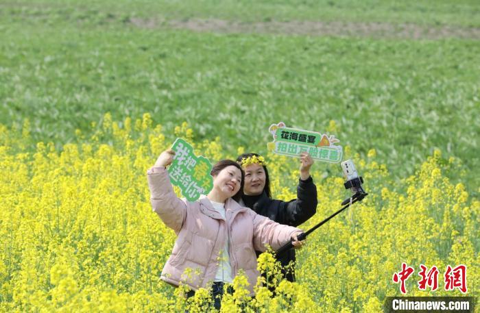 圖為游客在彭澤縣棉船鎮萬畝油菜花田里拍照打卡。彭琴 攝