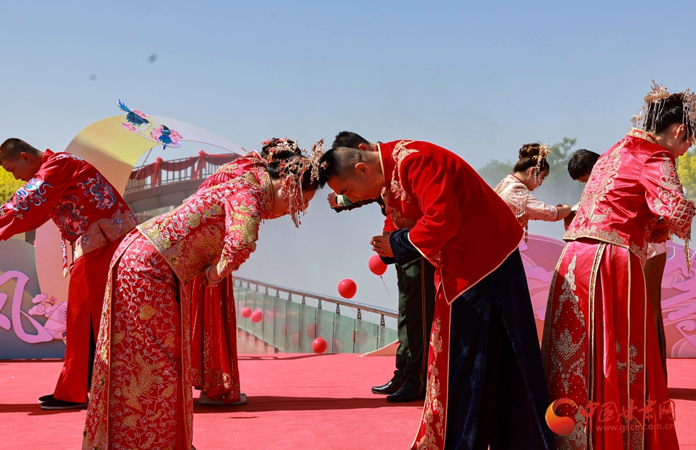 活動現場,古色古香的布置與悠揚婉轉的禮樂相得益彰。參加集體婚禮的新郎、新娘走過連心橋,共同牽繡球入場,舉行拜天地、行合巹禮等傳統儀式,一揖一禮間盡顯中式婚禮的莊重典雅與浪漫情懷,每一個環節都飽含著對新人的美好祝福。