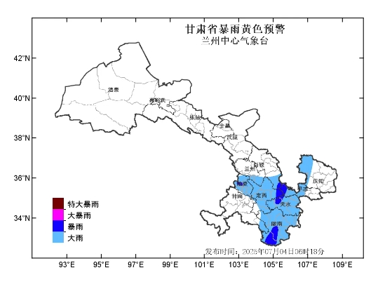 蘭州中心氣象臺2025年07月04日06時18分繼續發布暴雨黃色預警:過去24小時我省隴南市東部已出現大暴雨,最大降水量出現在武都裕河129.4毫米,預計未來12小時我省臨夏、定西、天水、隴南、平涼等州市部分地方及白銀市中南部、蘭州市南部、慶陽市北部、甘南州東南部有大雨,其中隴南市南部、天水市西部,定西市東部、平涼市西部、白銀市南部、臨夏州西部有暴雨,最大累計雨量60-90毫米,強降水將持續至4日17時,最大小時雨強可達20-50毫米。請注意防范強降水可能引發的中小河流洪水、城鄉積澇、山洪、滑坡和泥石流等次生災害。