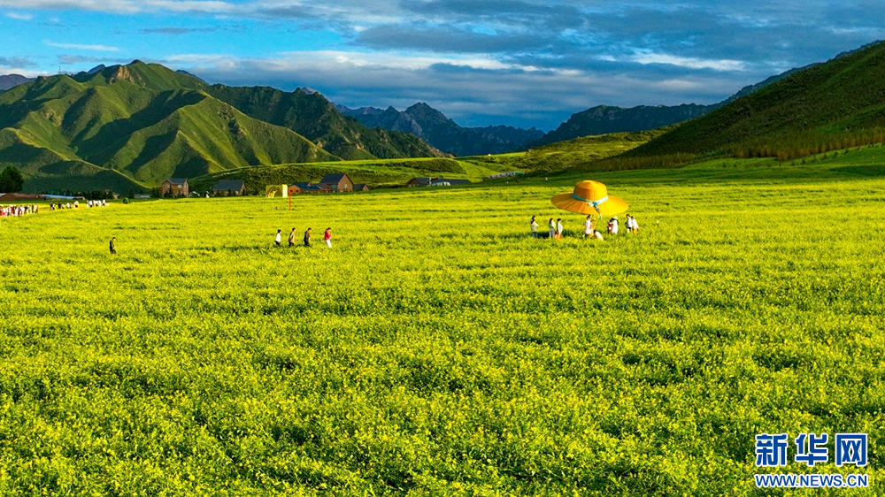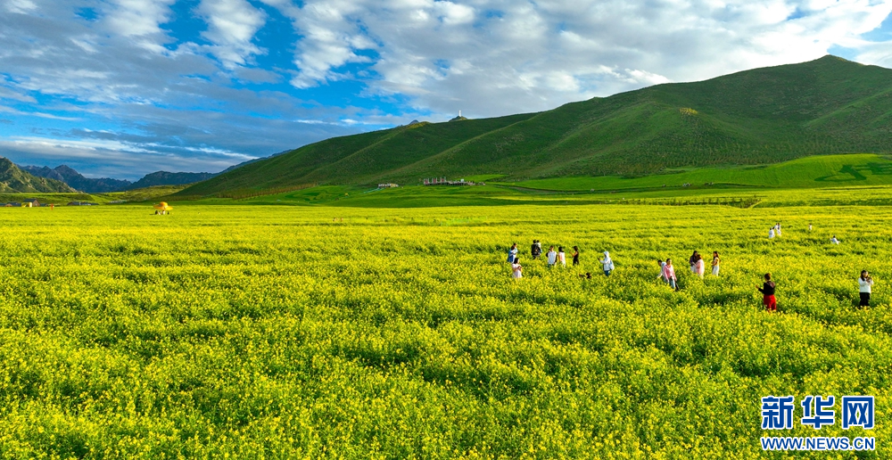 連日來,位于祁連山下的甘肅省張掖市民樂縣扁都口景區萬畝油菜進入盛花期。金黃的油菜花海與草原綠野相連,空氣中彌漫的淡淡花香,醞釀山川,醉了游人。新華網發(王將 攝)