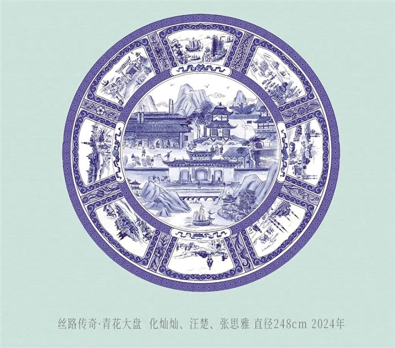 值得關(guān)注的是,展品中既有莫高窟第328窟復(fù)制彩塑這樣的經(jīng)典再現(xiàn),也有直徑達(dá)248厘米的“絲路傳奇·青花大盤”,呈現(xiàn)出多元文明共生的歷史圖景。瓷器作品是江西瓷藝大師歷時(shí)多年、多次赴敦煌采風(fēng)創(chuàng)作的結(jié)晶,通過高溫顏色釉的窯變特性,將敦煌壁畫的斑駁肌理與礦物顏料的神秘色彩凝固定格,在釉色流淌間實(shí)現(xiàn)古典美學(xué)與現(xiàn)代工藝的完美融合。