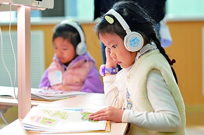 山東青島,小朋友在閱讀館體驗(yàn)AI閱讀。新華社發(fā)